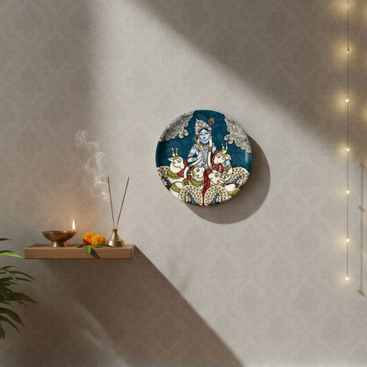 Dwarka Krishna with his Cows Kalamkari Wall plate with Wooden Stand - 8 inches