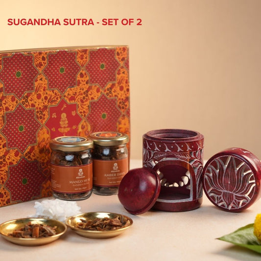 Sugandh Sutra Premium Home Fragrance Kit with Handcarved Natural Soapstone Burner – Set of 2 Bakhoor Blends (45 gm)