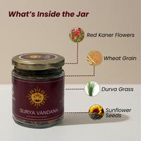 The Surya Vandana blend is dedicated to Surya Dev, the source of vitality, radiance, and life-force energy. Crafted with red kaner flowers, durva grass, sunflower seeds, and wheat grains, this Sunday samagri uplifts the spirit, enhances well-being, and fills your home with positivity and light.
