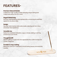Enhance your space with this exquisite marble incense holder with metal inlay, a perfect fusion of elegance and functionality. Crafted from premium natural marble, each piece showcases unique veining, making it truly one of a kind. The intricate metal inlay adds a touch of sophistication, complementing any decor style. Designed to securely hold incense sticks while collecting ash, it ensures a clean and serene experience. Ideal for meditation, relaxation, or home decor, this luxurious incense holder brings a calming ambiance to any space. A thoughtful gift for those who appreciate fine craftsmanship and a touch of modern elegance.
