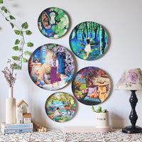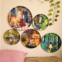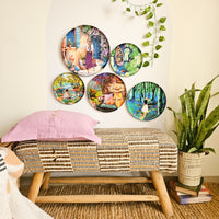 Set of 5: Ritualistic Wall Plates and paintings are sold as a set, this collection includes 5 sizes (1x12", 2x10", and 2x8" diameter), offering a variety of options for creating a visually appealing display.